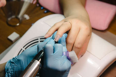 Female master uses an electric machine to remove the nail polish during manicure in the salon. Close-up hardware manicure. Concept of hand care. Female manicurist cleaning of nails by a milling cutter.