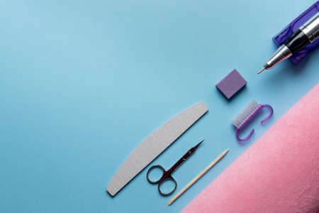 Professional stylish trendy blue Hardware Manicure. Procedure for the preparation of nails. Top view flat lay. Do manicure by yourself staying at home. self care. Spa, beautician advertisement.