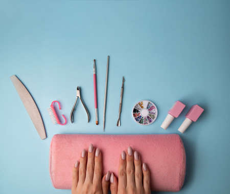 Female hands with beautiful manicure and manicure accessories on a blue background,top view, flat lay. Beauty accessories for manicure and pedicure on a blue background,banner