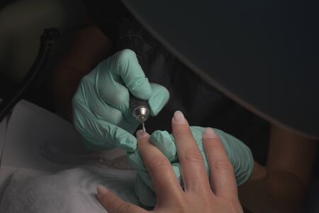 Hardware manicure. Removal of old gel varnish in the salon. Manicure master doing beauty procedure for client, closeup and top view.