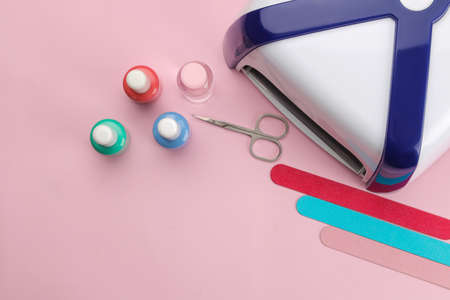 Manicure. nail polishes, UV lamp and various accessories and tools for manicure on a trendy pink background. top view