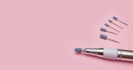 Hardware manicure. Elderly hands. Flat layout. Color background. Nozzles for manicure machine.