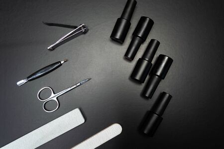 Set of cosmetic tools for manicure and pedicure on a black background. Gel polishes, nail files, nippers