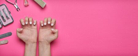 Manicure and pedicure tools on pink background. Nail salon banner design template. Beauty treatment and hand care concept