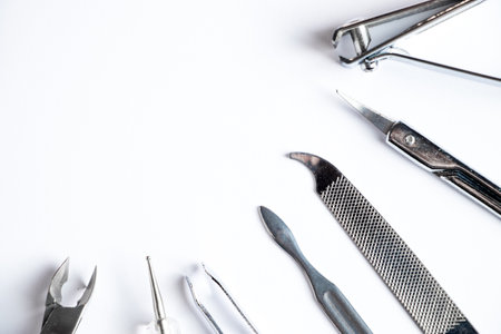 pedicure and podiatry tools. Scissors, nail clippers and orange stick to fix and treat feet. body care and beauty