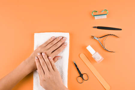 Woman hands, nail polish, manicure tools and towel on orange table top flat lay. How to do manicure at home concept. Do manicure by yourself while staying at home, top view