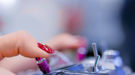 Female manicurist doing a professional manicure hardware using milling cutter on the background of the tools. Top view of blue