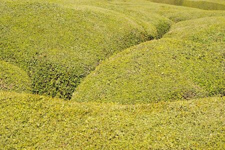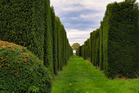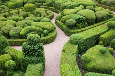 Landscape with a hedge of boxwood bushes and a path for walking through the maze.