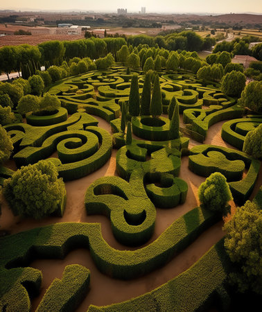 A beautiful hedge maze with perfect geometric shapes, offering a serene and enchanting view from above.