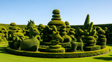 A stunning topiary garden featuring intricately trimmed bushes in various animal shapes and designs, set against a clear blue sky.