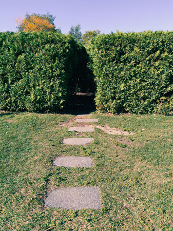 Stone path in the garden with green bushes and trees in the background. Entrance to an outdoor cedar maze.