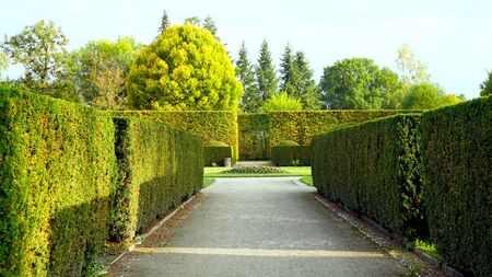 park maze of hedged deciduous bushes in the backyard with pebbled path on a sunny summer day in the botanical garden, nobody.