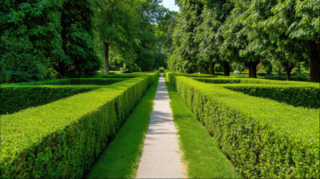 A picturesque garden pathway lined with perfectly trimmed hedges creates a serene escape. The vibrant greenery invites peaceful strolls under a bright sky.