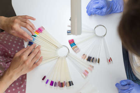Choice of color of nails. a young girl of twenty seven years old chooses a color for nails in a beauty salon. beauty and health of nails. Color and painting of manicure, beautiful female nails. False nails palettes of different colors in nail salon. Colorful artificial nails. Manicure treatment in blurry background