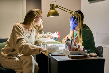 The client chooses a red shade of varnish from display for the manicure. Master in blue gloves making facepalm under the gold lamp. Client dries right hand in the UV lamp. Blonde and brunette.