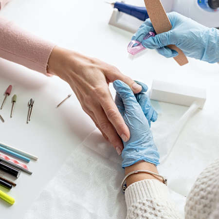 Manicurist master makes nail filing on woman hand closeup, selective focus