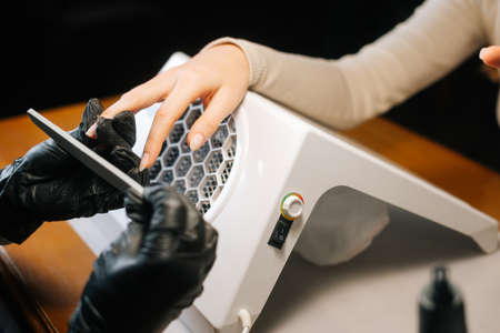 Hardware manicure in a beauty salon. Manicurist is applying electric nail file drill to manicure on female fingers.