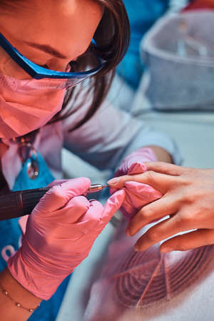Close Up shot of hardware manicure in a beauty salon. Manicurist in protective gloves is applying electric nail file drill to manicure on female fingers