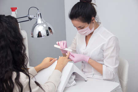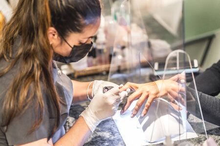 Manicure salon, covid-19 and social distance. Manicure master using nail file to buff the nail of a client