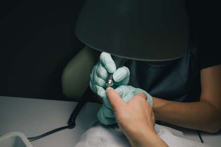 Closeup shot of master in rubber gloves applying an electric nail file drill to trim and remove cuticles in the beauty salon. Beauty and nail care concept