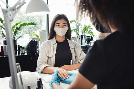Reopening due to pandemic, security measures. Asian woman in protective mask looks at african american master during nails procedure