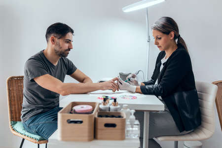 Shot of cosmetologist woman making permanent manicure to handsome man in salon. Beauty concept.