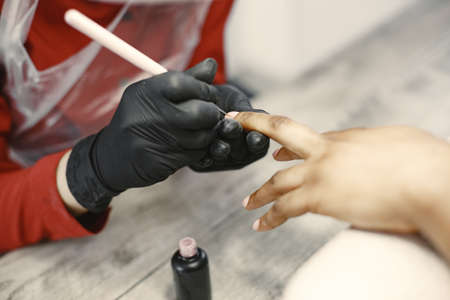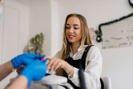 The manicure master in the beauty salon performs the procedure of coloring the client's nails. Women's fashion and beauty. self care.