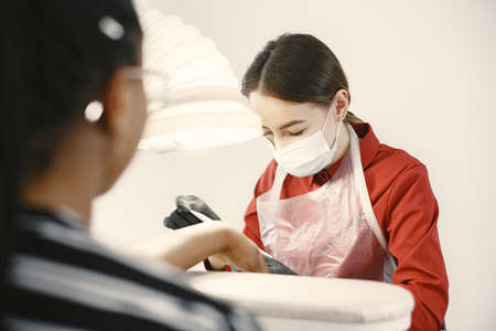 Nail master in medical mask doing professional manicure for white caucasian model, backlight