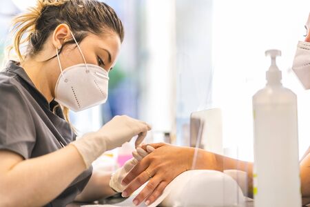 A manicure and pedicure salon worker with security measures and face masks. The reopening due to the covid-19 pandemic. Coronavirus