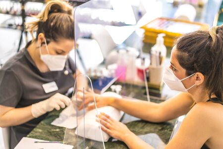 Manicure and pedicure salon, coronavirus, covid-19, social distance. The reopening due to the pandemic, security measures. Female worker with face mask behind protective screen working with a client