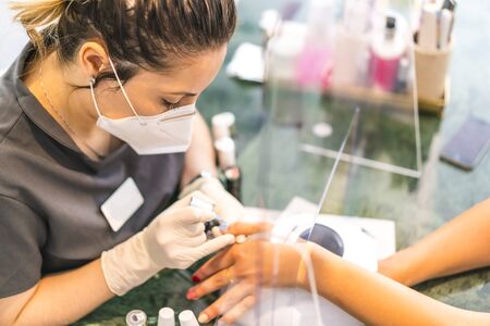Latin girl with face mask painting colorful nails of the client. Reopening after the corod-19 pandemic. Manicure and Pedicure Salon. Coronavirus