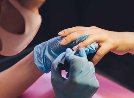 Closeup photo shoot of manicure process. Master has pink gloves and protective face mask.