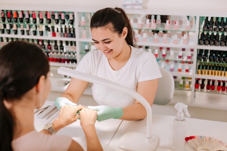 A manicurist gives a manicure to a client. Portrait of an attractive nail salon worker giving a manicure to one of her regular customers