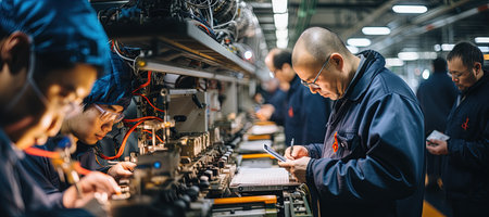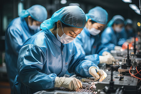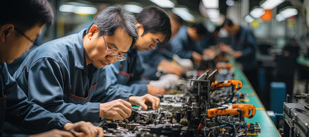 Asian workers are working diligently in a high-tech factory surrounded by machinery. Concept Manufacturing, Factory Workers, Technology, Asian Workers, Diligent Work