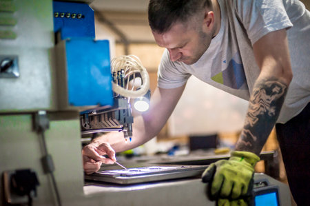 A dedicated craftsman works intently in a modern workshop, showcasing precision and focus as he engages with tools and machinery in a professional setting.