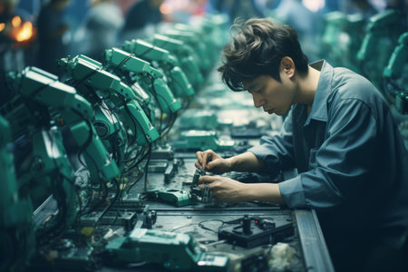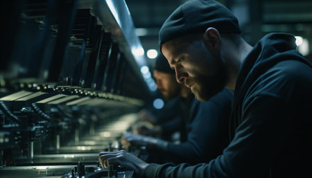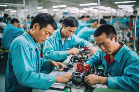 Factory workers play a crucial role in manufacturing processes, operating machinery, assembling products, and maintaining production lines. Generated with AI