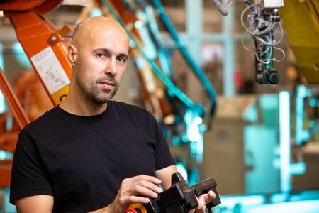 Portrait of satisfied employee in industrial smart factory, recruitment of new employee due to economic crisis, industry concept