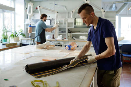 Young manufactory worker with scissors cutting special material by workplace during process of making leg prostheses