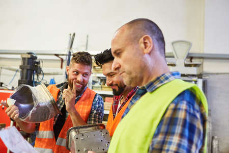 Group of factory workers using machine equipment in factory workshop . Industry and engineering concept .