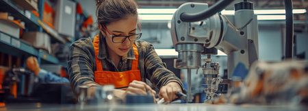 In a state-of-the-art industrial workshop, a technician meticulously adjusts complex machinery. Surrounded by tools, the atmosphere is focused and industrial as dusk approaches.