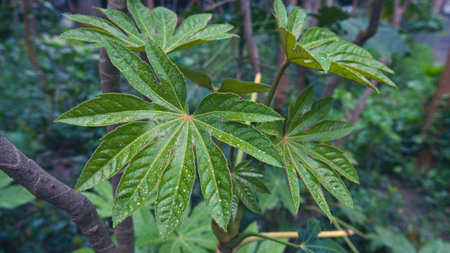 cassava leaves with sharp green veins pattern showing natural tropical foliage and healthy agriculture crop