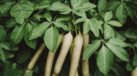 Lush green cassava roots emerge from vibrant foliage, highlighting the beauty of agriculture. A perfect representation of natural food cultivation in a tropical setting.