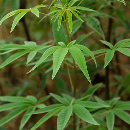 Green cassava leaves (Manihot esculenta), commonly called cassava manioc, or yuca, in shallow focus. It can be used for vegetables.