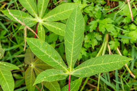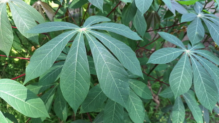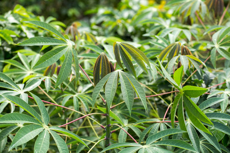 detailed closeup of fresh green cassava leaves with natural background in tropical farmland