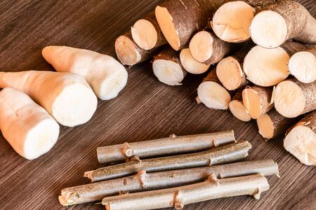 cassava isolated on white background, cassava for tapioca flour industry, raw manioc cassava in top view
