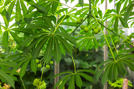 Lush green cassava roots emerge from vibrant foliage, highlighting the beauty of agriculture. A perfect representation of natural food cultivation in a tropical setting.
