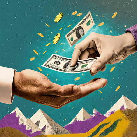 Close up of human hands giving money to another person. Mixed media