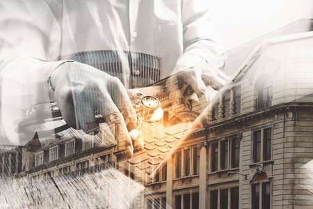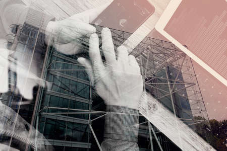 double exposure,hipster hand using smart phone,digital tablet docking keyboard,coffee cup, payments online business,sitting on sofa in living room,work at home concept,London architecture city