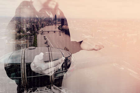 double exposure of man hand using VOIP headset with digital tablet computer docking keyboard,smart phone,concept communication, it support, call center and customer service help desk,London architecture city