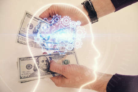 Multi exposure of brain drawing hologram and us dollars bills and man hands. Ai invest concept